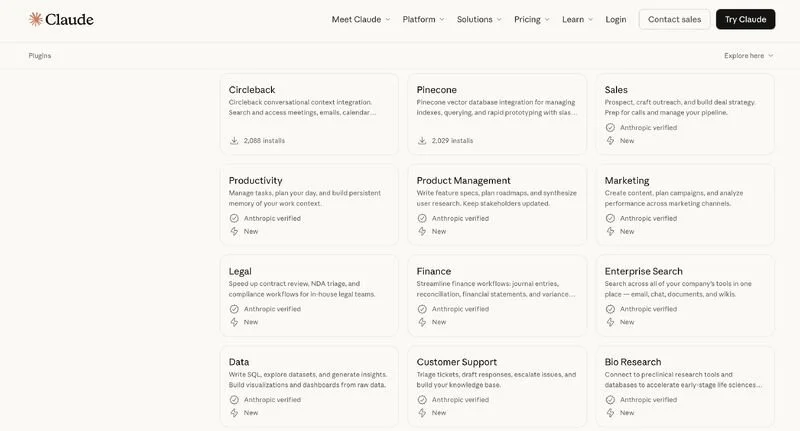 New plugins include: Sales, Marketing, Productivity, Product Management, Legal, Finance, Data, Customer Research and Bio Research.