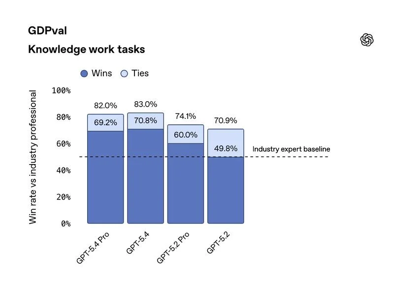 OpenAI launches 5.4 and improves GDPVal to 83%