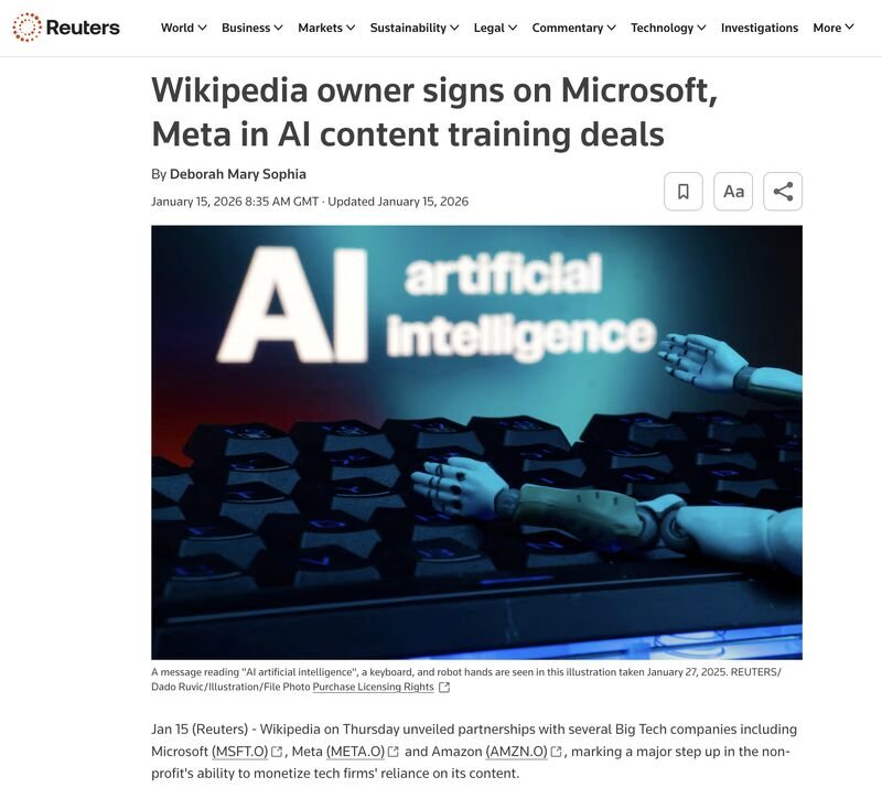 On Jan 15, Wikipedia's owner confirmed that it has agreed licensing arrangements with Microsoft, Meta and Amazon. It had previously agreed licensing with Google back in 2022, along with Perplexity and Mistral AI.